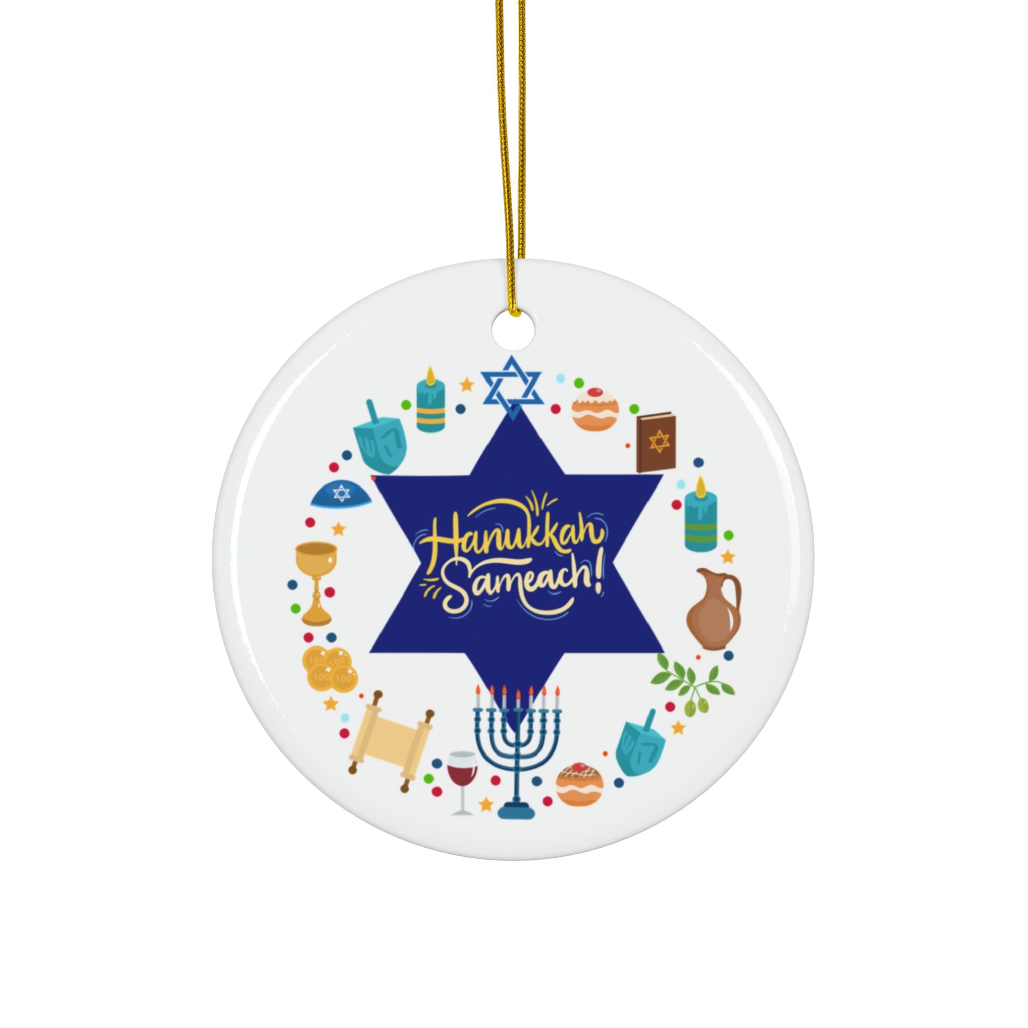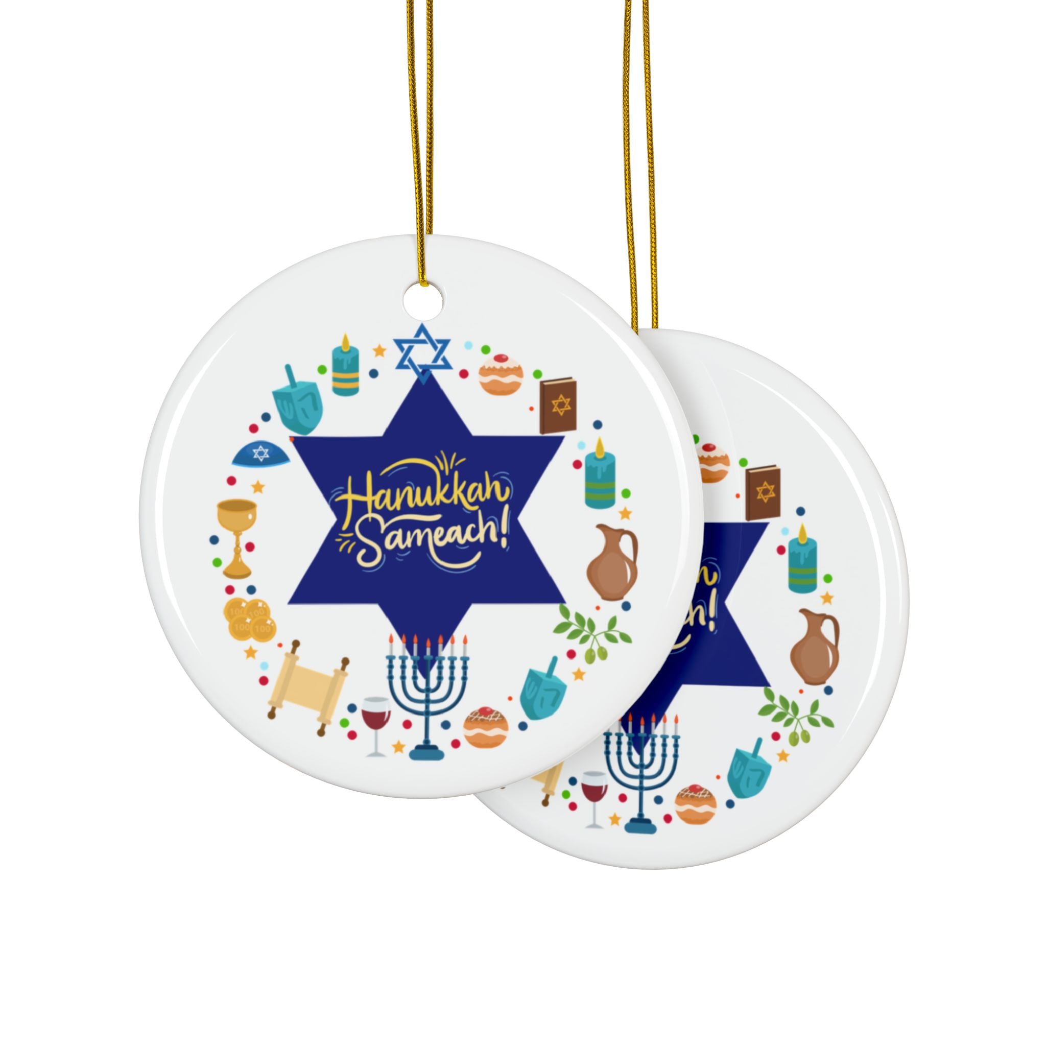 Spread eight nights of happiness with this delightful ceramic ornament that shouts "Hanukkah Sameach" loud and clear—literally on both sides! Whether it's swinging from your menorah display, dangling in a window, or tucked into a gift bag, this cheerful keepsake brings playful spirit to your holiday celebrations. A fun, festive way to deck the halls with Hanukkah joy that'll have everyone smiling.