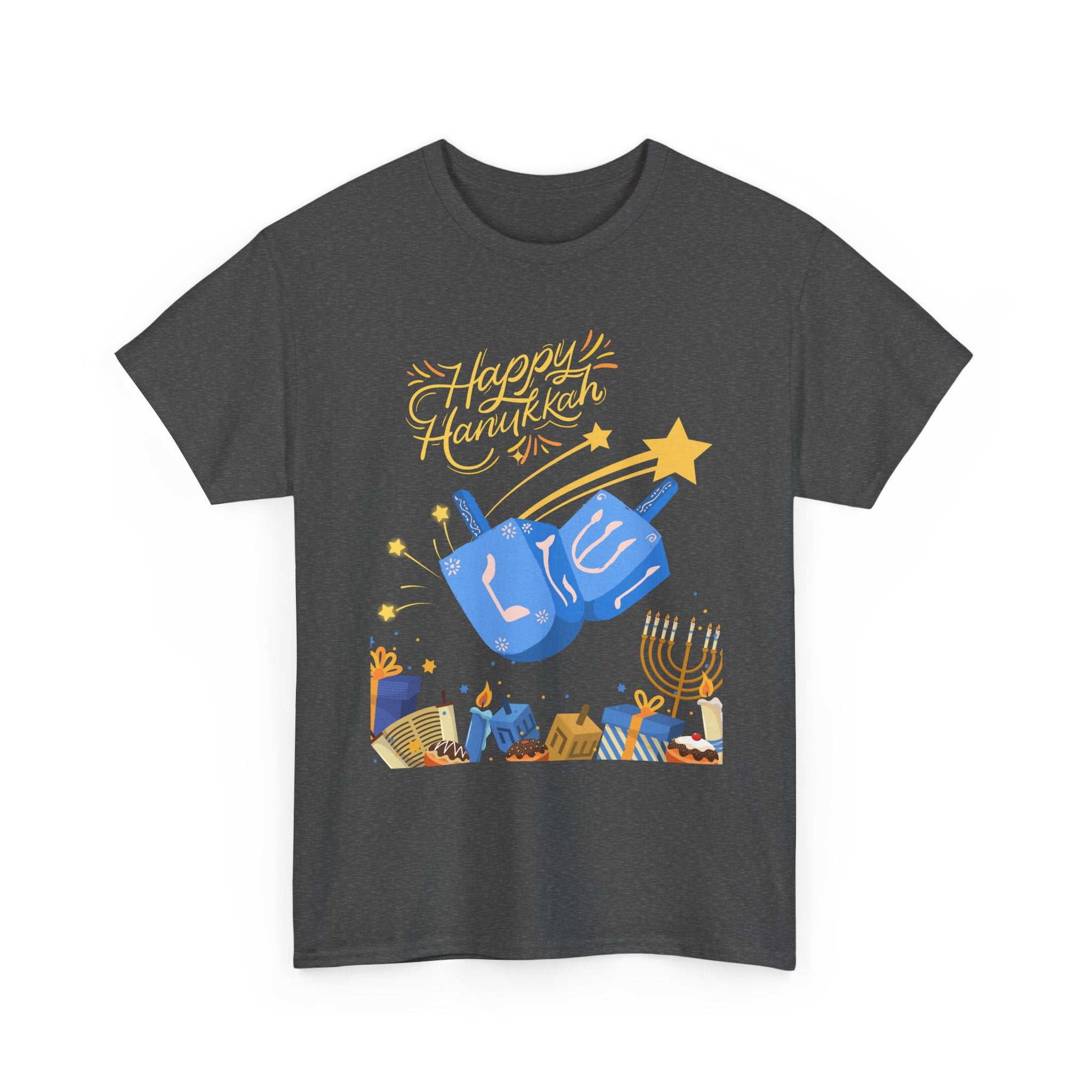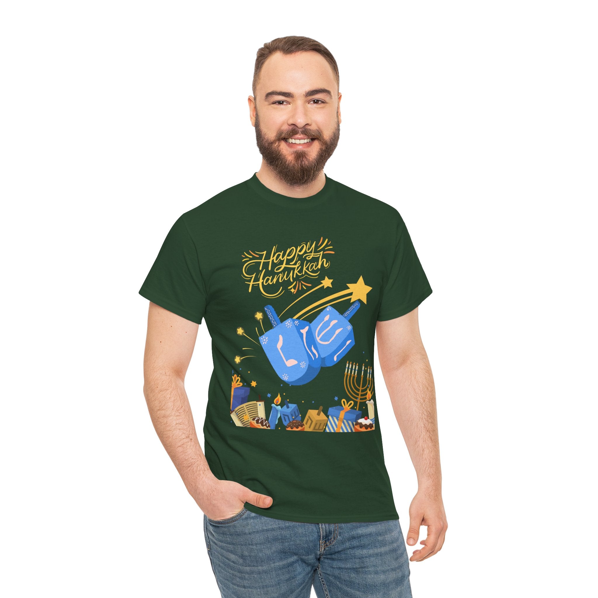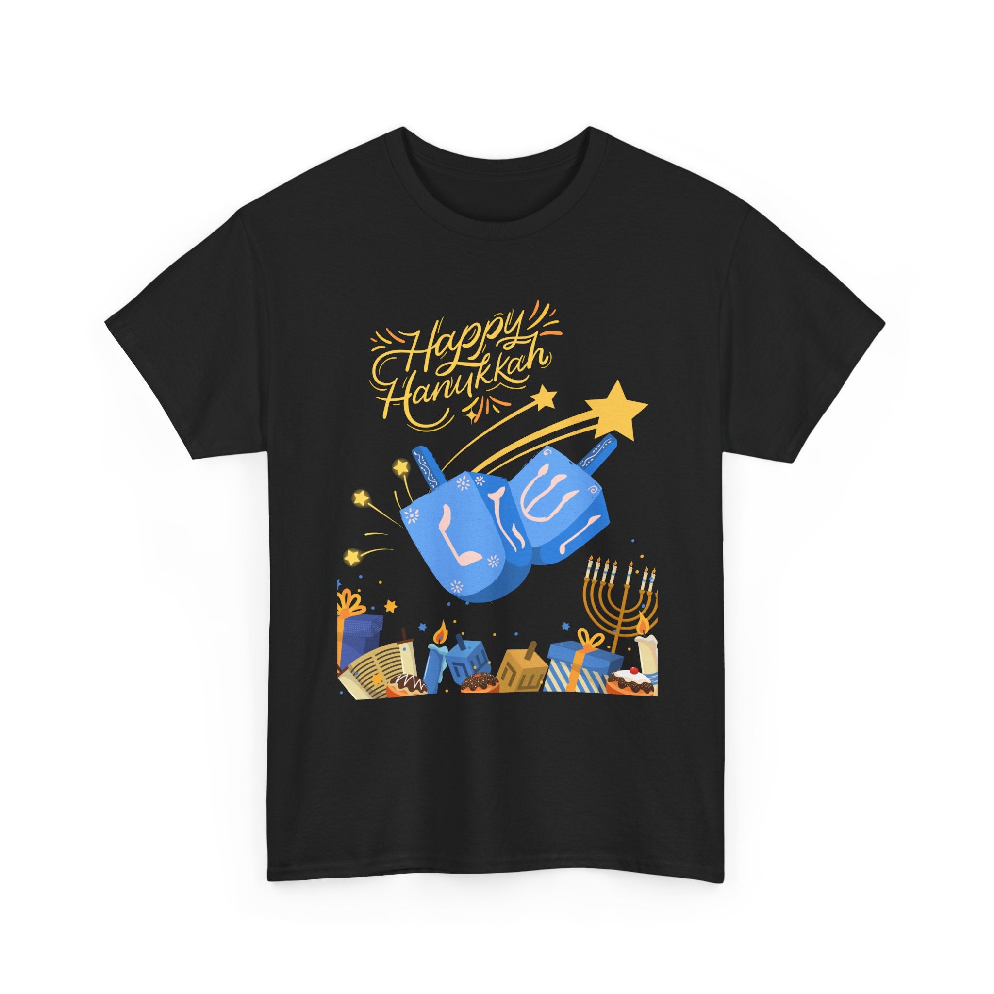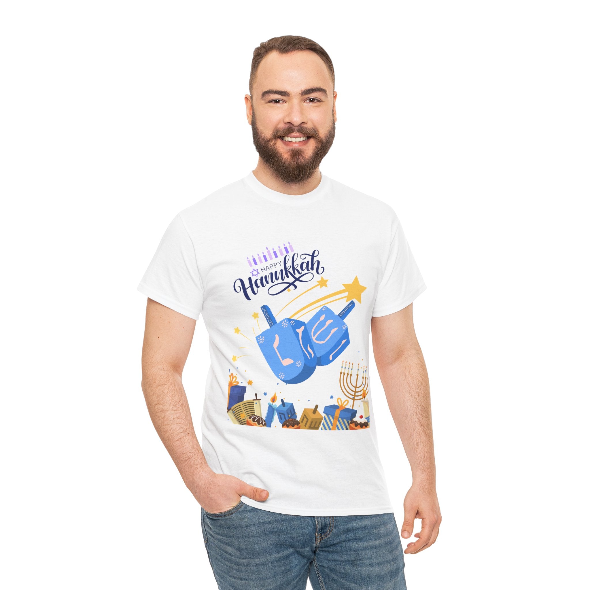 A cheerful Hanukkah tee that brings the warm glow of the holiday into everyday wear. Soft, midweight cotton holds bright, crisp prints — a playful pair of dreidels, menorah, gifts and stars sit amid festive confetti and hand-lettered “Hanukkah” script. The classic crew neck and relaxed cut make this a comfortable layer for family gatherings, candle-lighting nights, or casual strolls through winter markets. Durable construction and tear-away label keep it comfortable through repeated wear and laundry, while ethically sourced cotton and reliable printing methods ensure the colors stay vibrant.