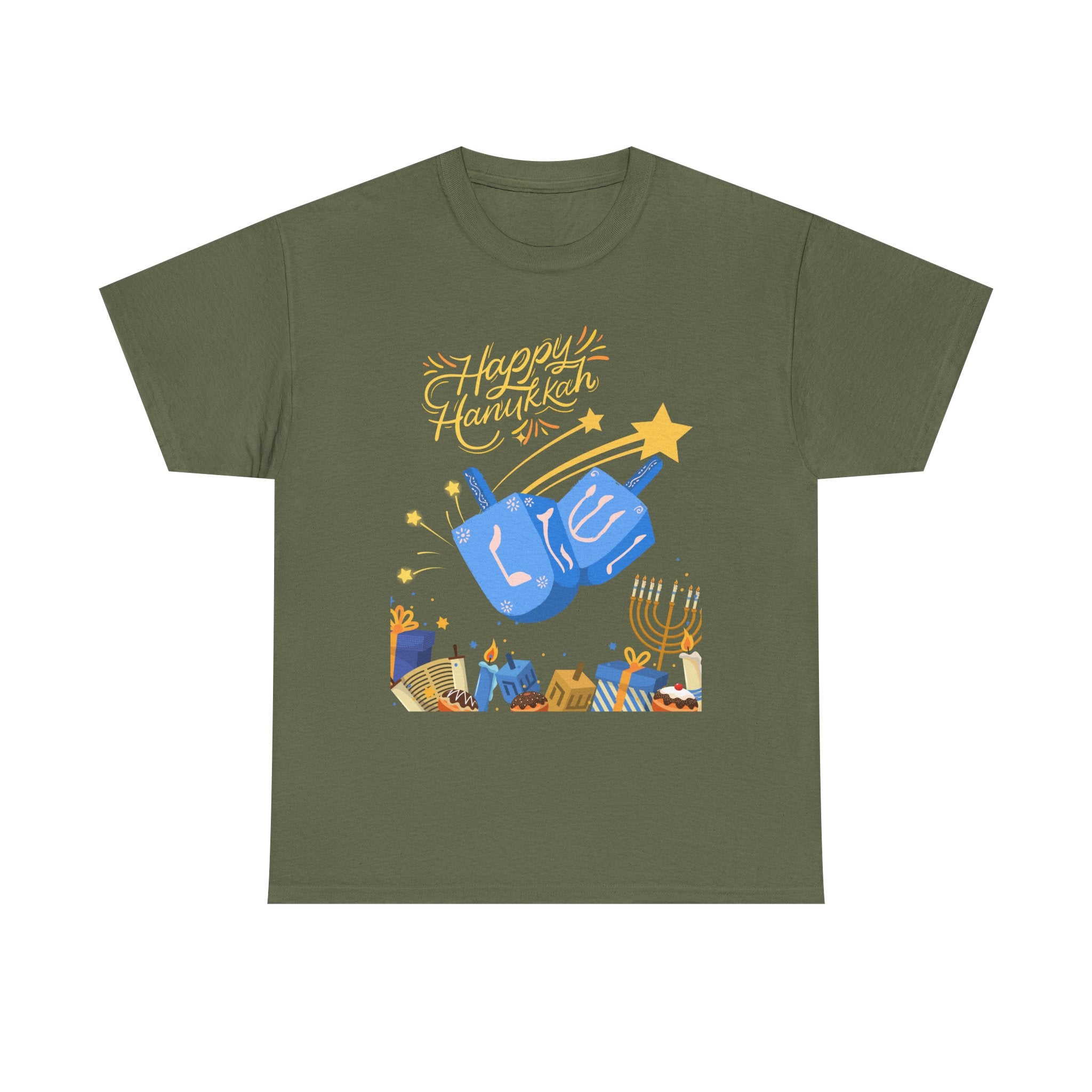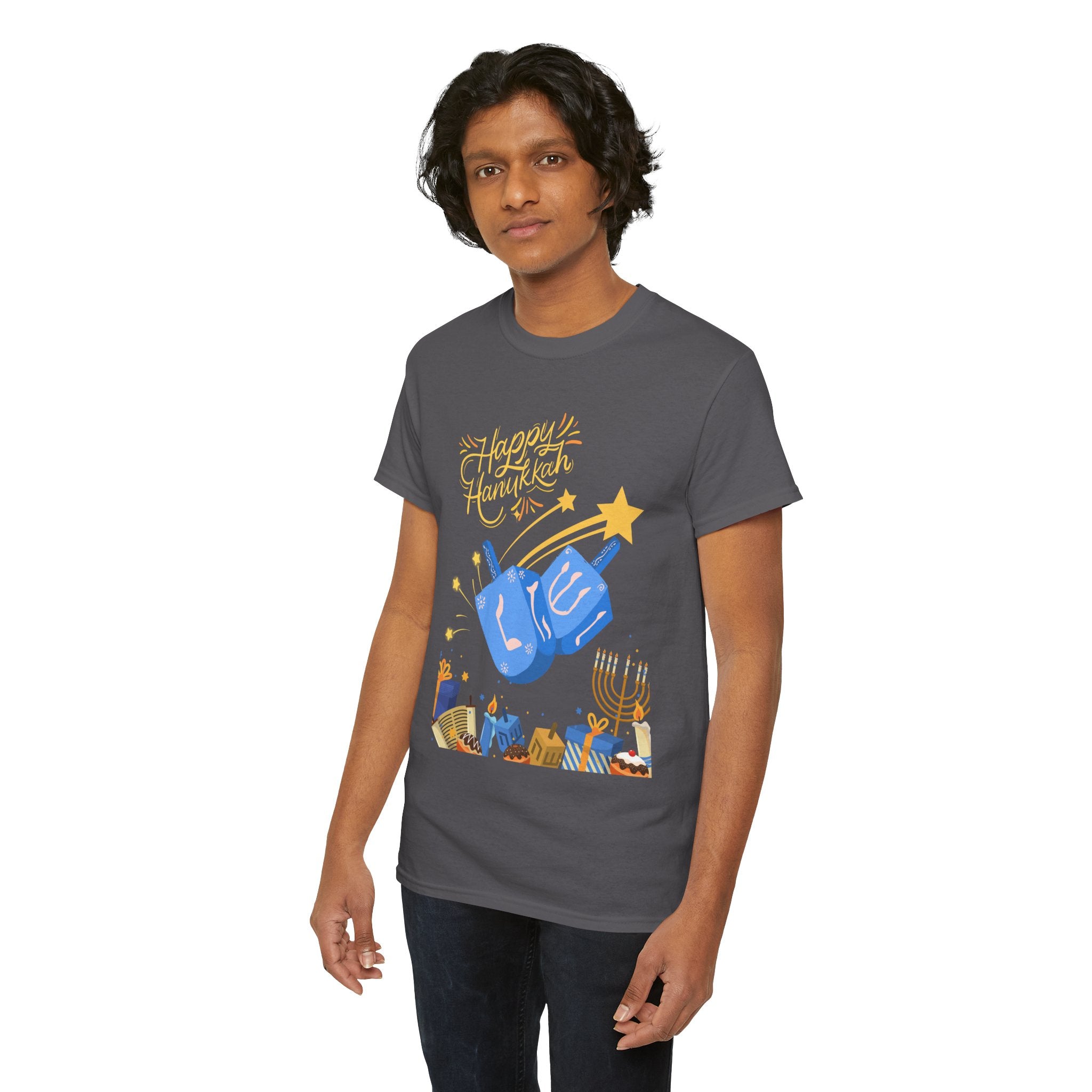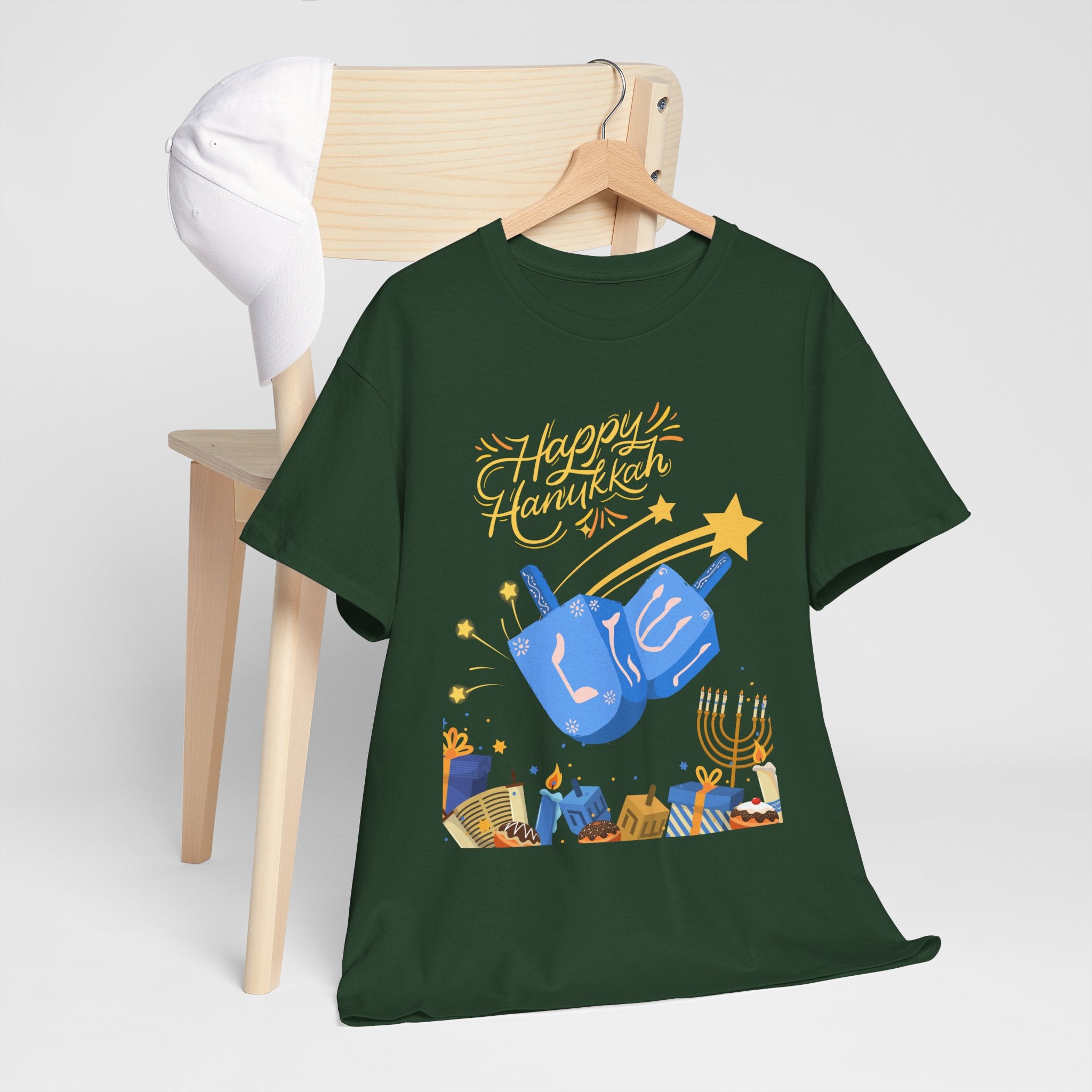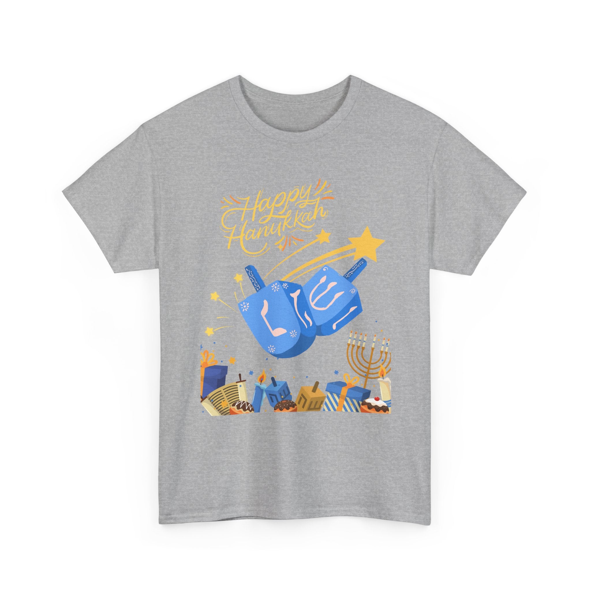 A cheerful Hanukkah tee that brings the warm glow of the holiday into everyday wear. Soft, midweight cotton holds bright, crisp prints — a playful pair of dreidels, menorah, gifts and stars sit amid festive confetti and hand-lettered “Hanukkah” script. The classic crew neck and relaxed cut make this a comfortable layer for family gatherings, candle-lighting nights, or casual strolls through winter markets. Durable construction and tear-away label keep it comfortable through repeated wear and laundry, while ethically sourced cotton and reliable printing methods ensure the colors stay vibrant.