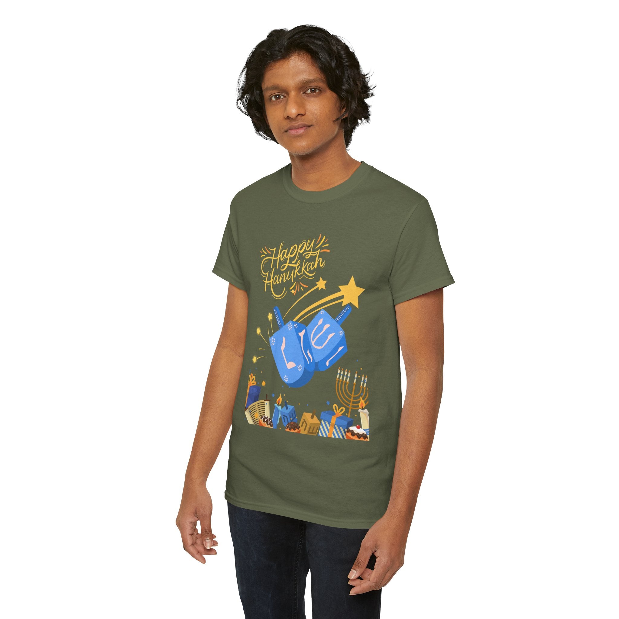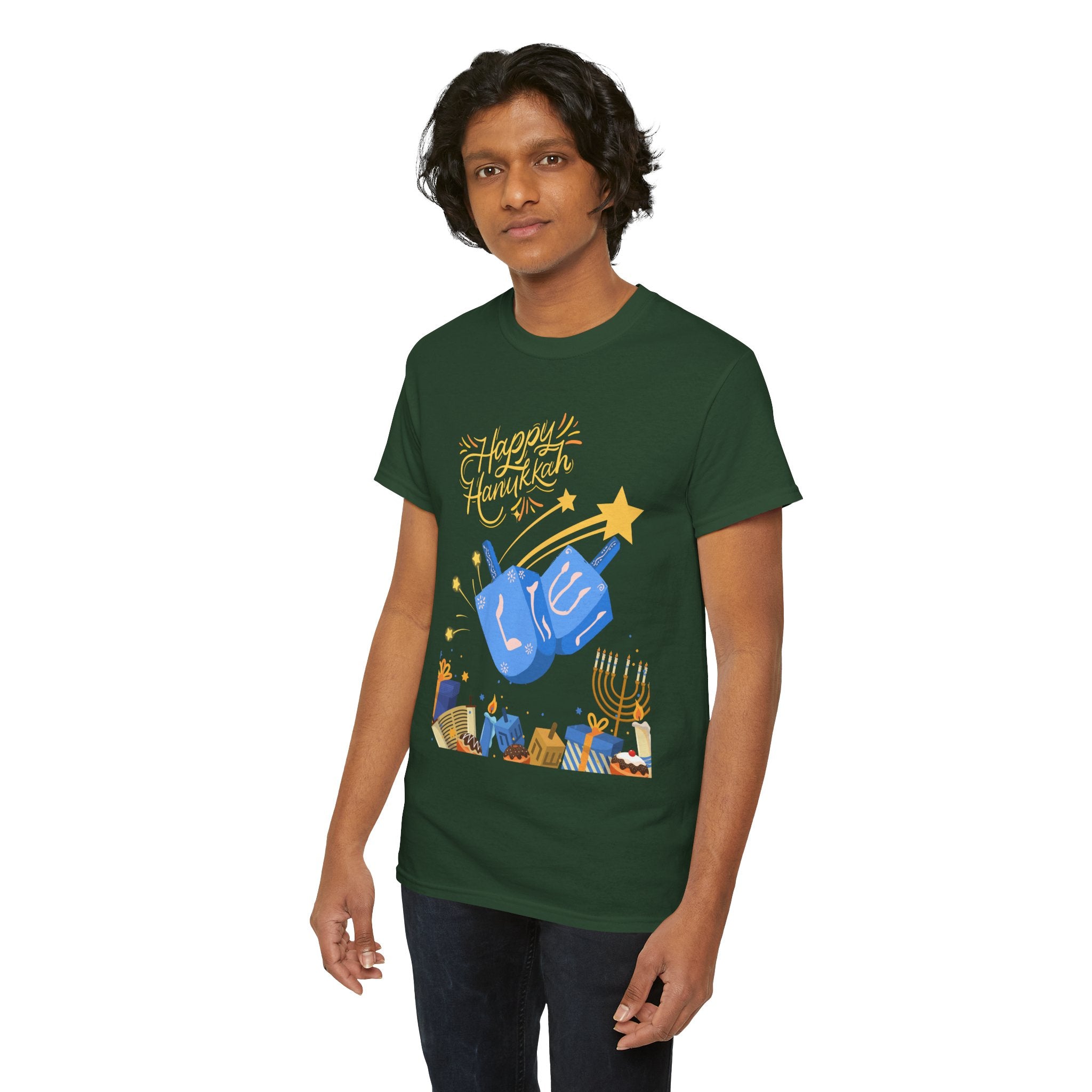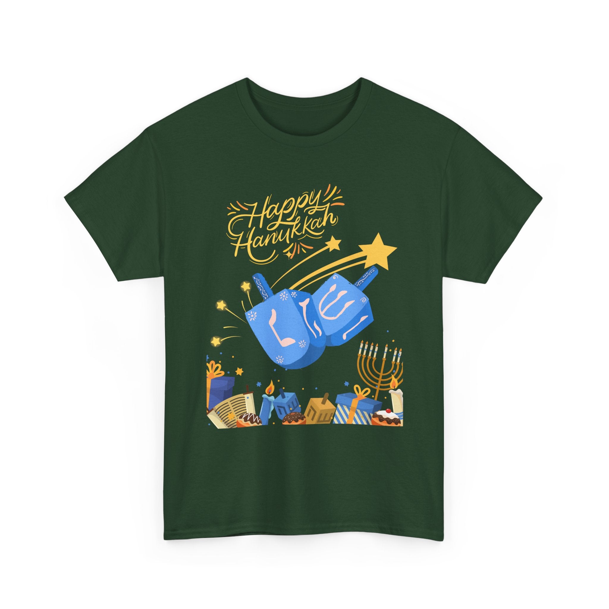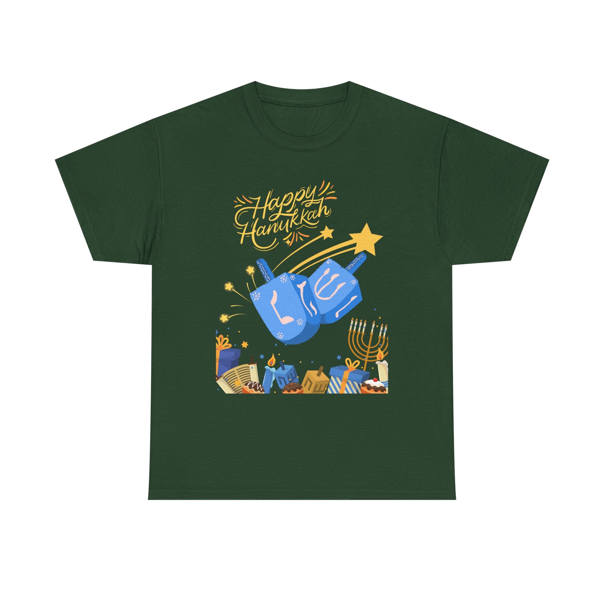 A cheerful Hanukkah tee that brings the warm glow of the holiday into everyday wear. Soft, midweight cotton holds bright, crisp prints — a playful pair of dreidels, menorah, gifts and stars sit amid festive confetti and hand-lettered “Hanukkah” script. The classic crew neck and relaxed cut make this a comfortable layer for family gatherings, candle-lighting nights, or casual strolls through winter markets. Durable construction and tear-away label keep it comfortable through repeated wear and laundry, while ethically sourced cotton and reliable printing methods ensure the colors stay vibrant.