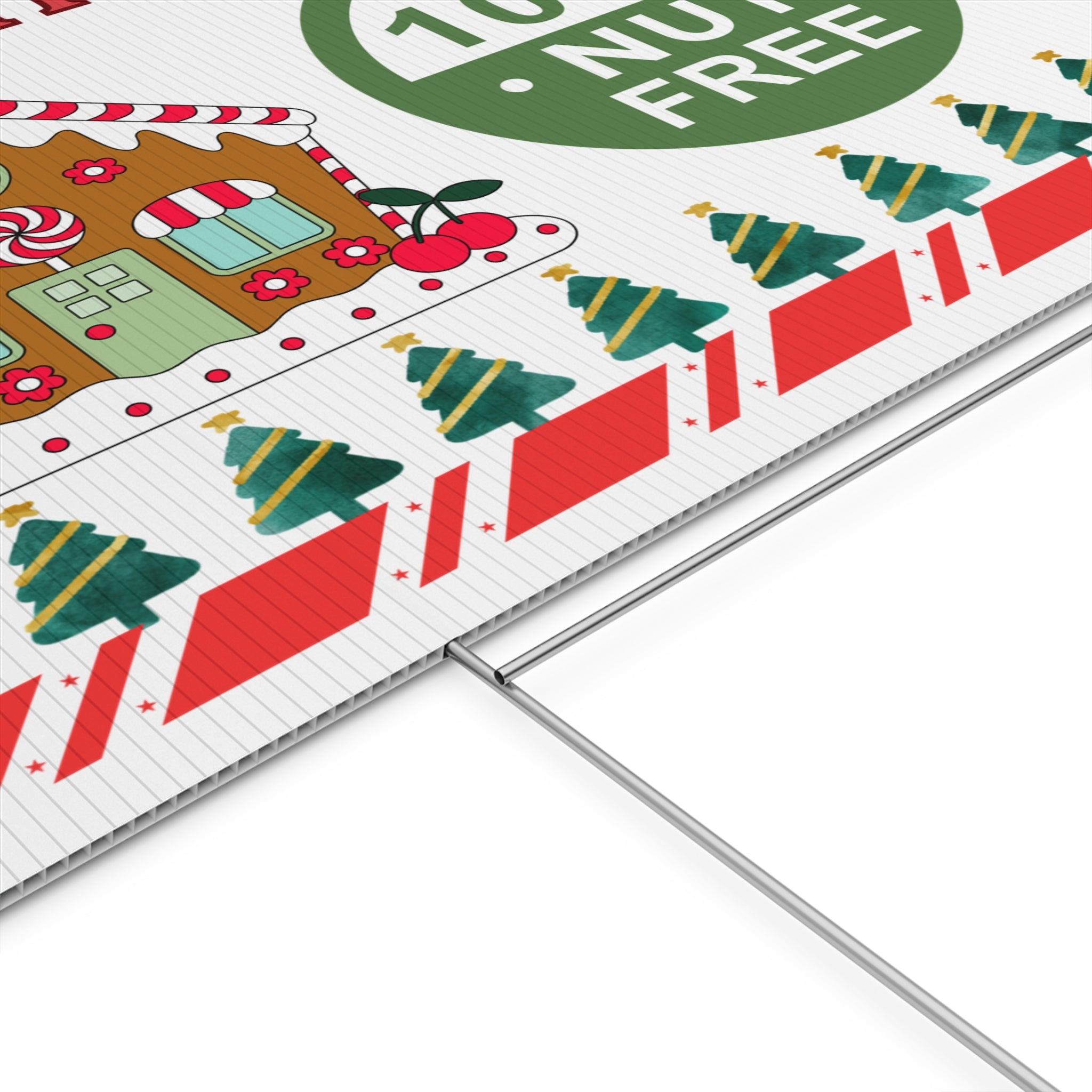 A cheerful outdoor yard sign that announces a warm, family-friendly welcome with a playful gingerbread-house design and a clear “100% Nutsy Free” emblem. The bright, holiday-inspired artwork and double-sided print make this sign easy to spot from the street and reassuring for visitors, delivery drivers, and neighbors. Durable corrugated plastic with a matte finish and included aluminum stake keep it upright through seasonal weather. Choose portrait or landscape and one of three sizes to fit your garden, walkway, or lawn display — handcrafted and printed in the USA.