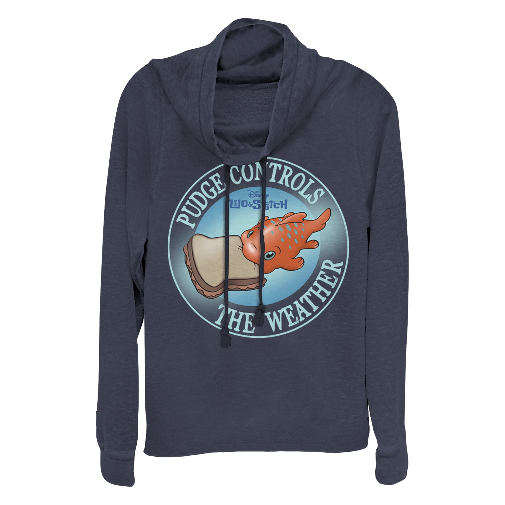 Ohana means family, and family means no tee gets left behind! Find the perfect style for your family with this new Juniors' Disney Lilo & Stitch Pudge Controls the Weather Graphic Cowl Neck Sweatshirt! This fun design features Pudge the tropical fish with a peanut butter sandwich in his mouth framed by the words "Pudge Controls The Weather" in distressed blue letters. Celebrate a certain alien, otherwise known as Experiment 626 in style with new hilarious apparel for the whole family from the movie!
