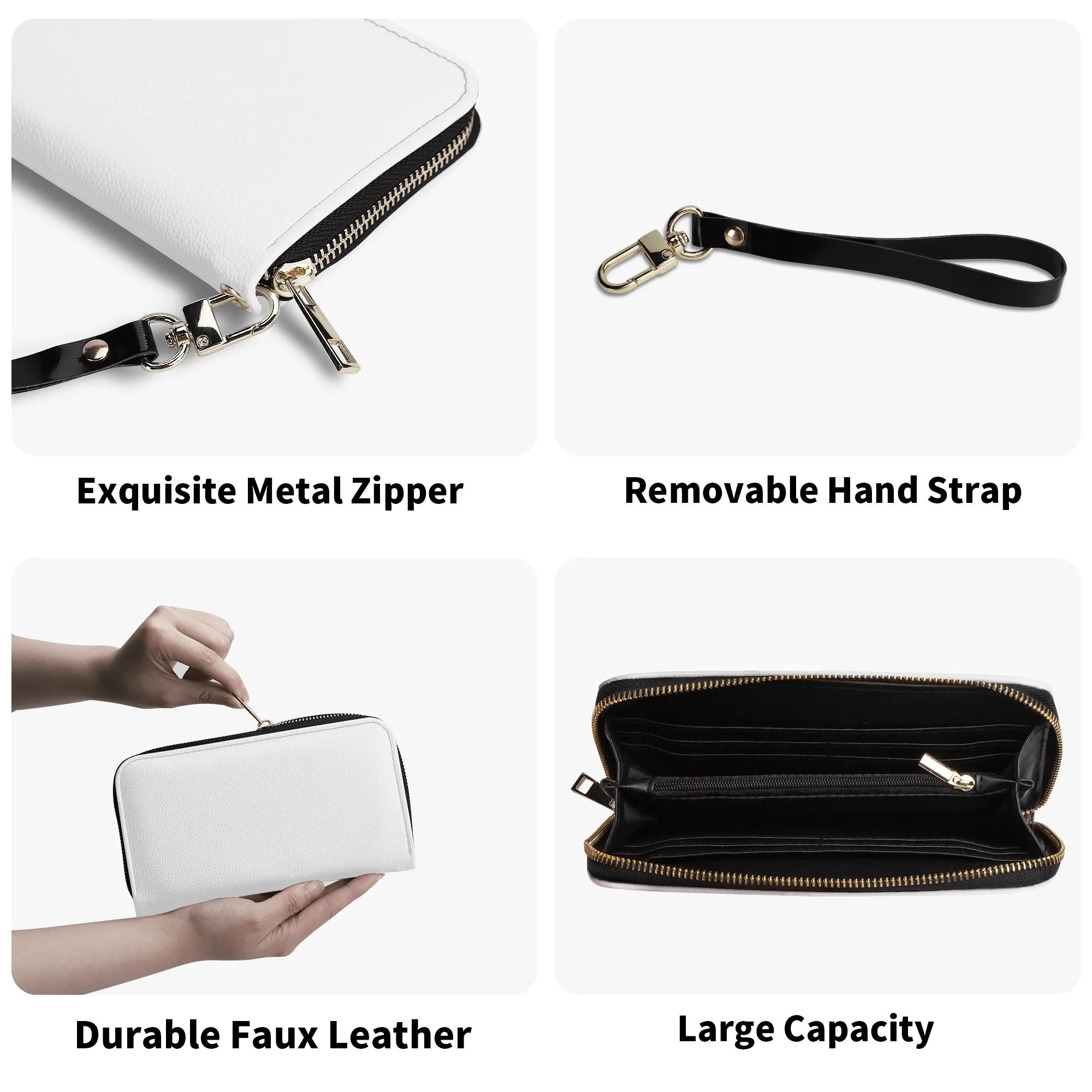 Available in sleek black and sophisticated white interiors, this wallet adds a touch of refined style to any outfit. The handy carrying strap ensures easy and secure handling, making it ideal for daily use or special occasions.