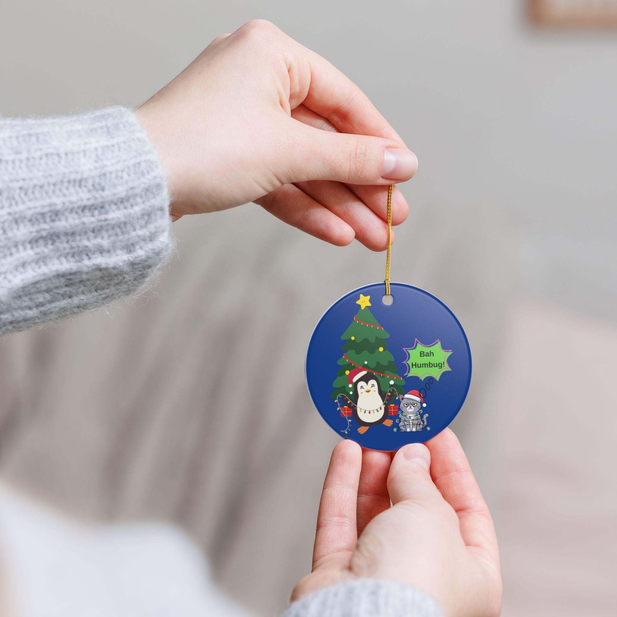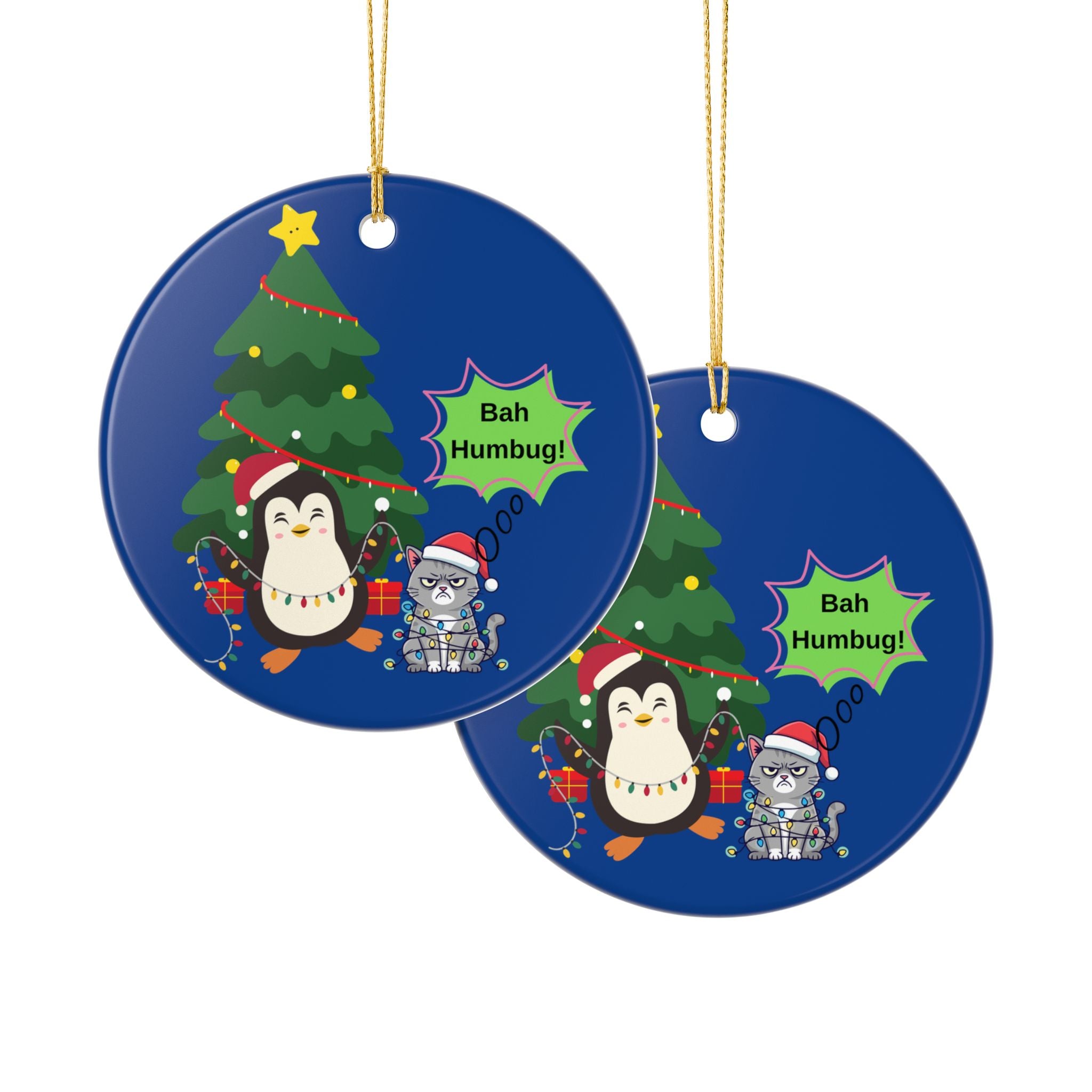 A cheerful ceramic ornament that brings playful holiday spirit to any tree or cozy corner. Bright, glossy white ceramic showcases a double-sided print of a festive penguin tangled in lights beside a grumpy cat declaring “Bah Humbug!” The deep blue background makes the colors pop, while the matte-printed illustration gives a soft, hand-drawn feel. Hung from the included gold string, this lightweight round ornament adds a touch of humor and personality to seasonal decor, stocking displays, or a cheerful window accent.
