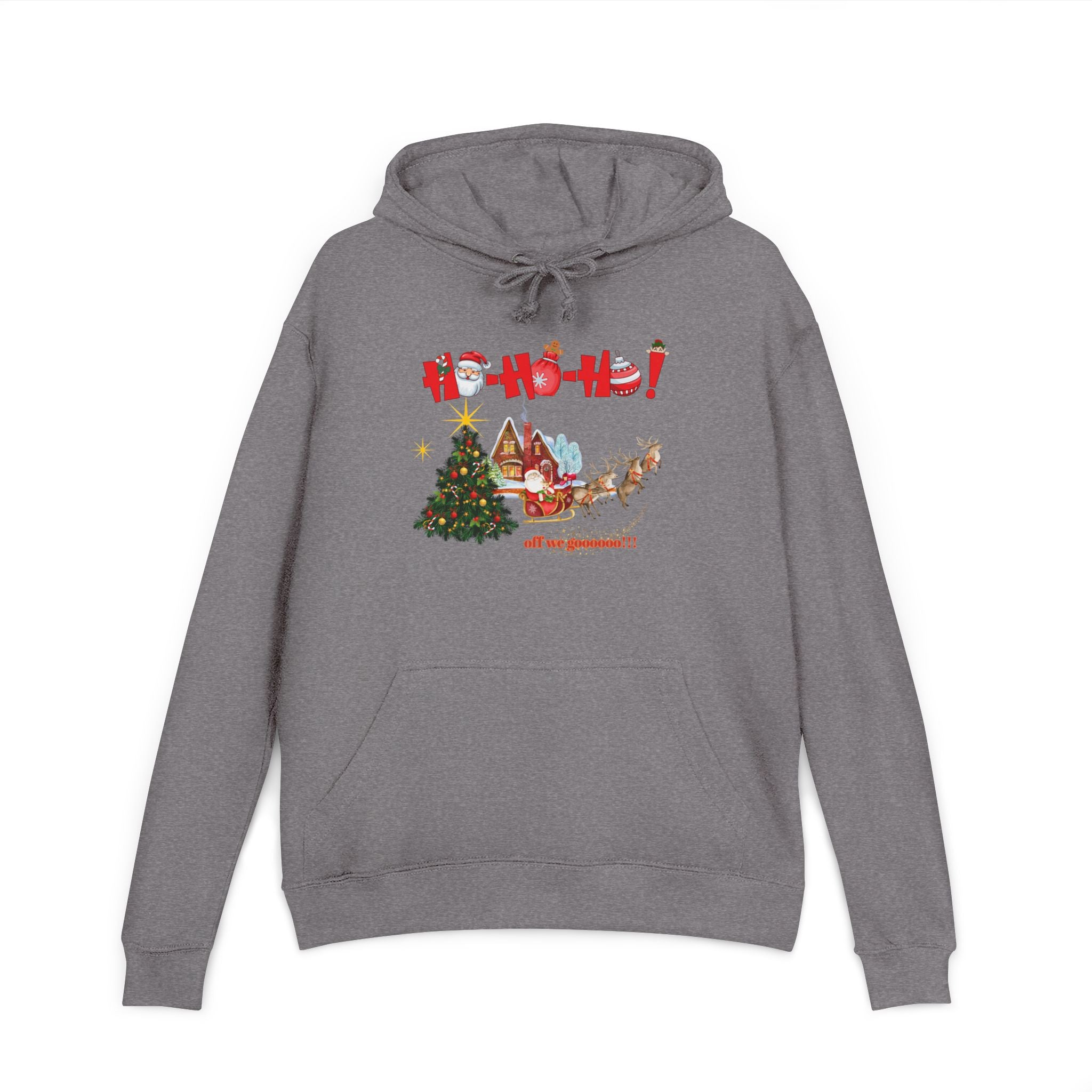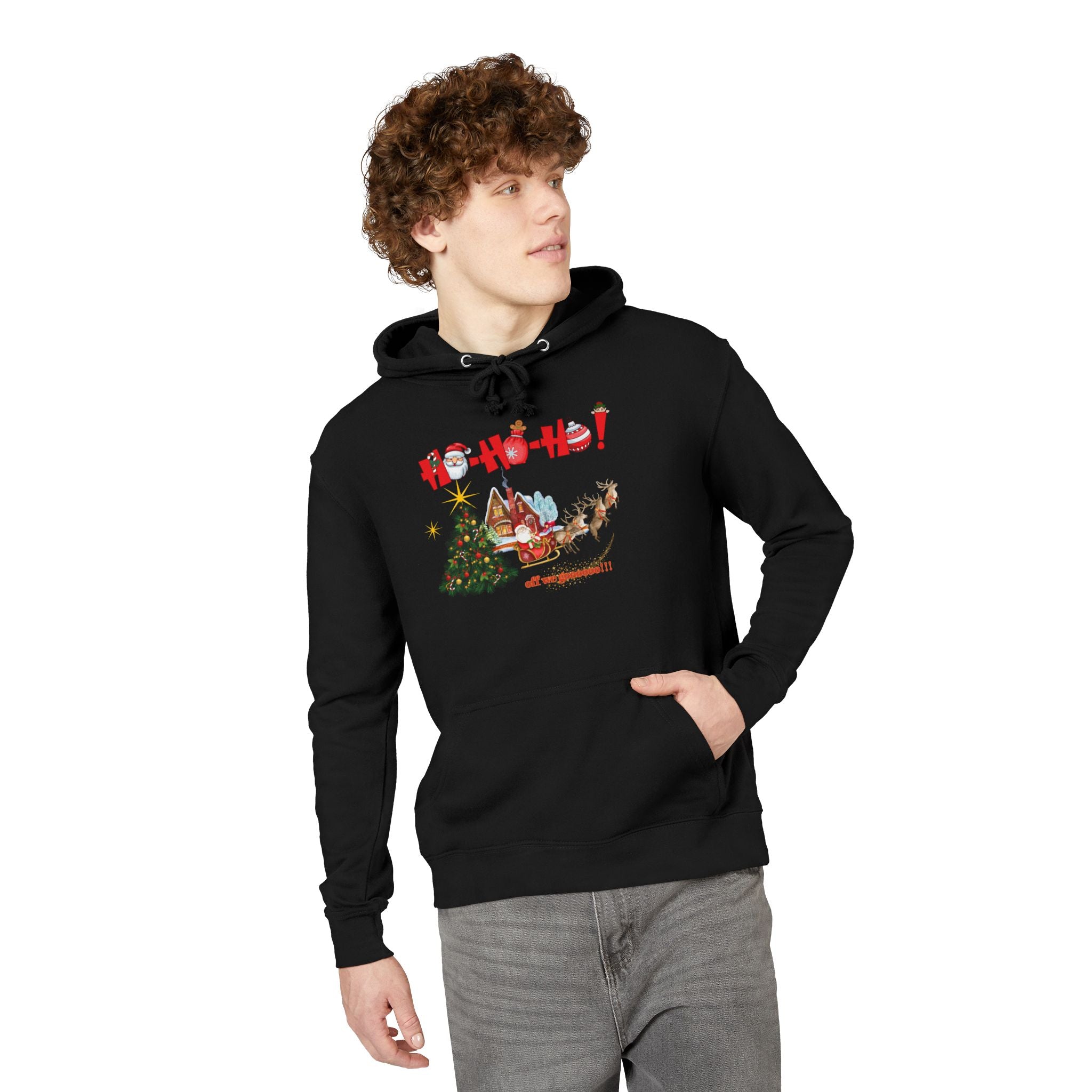 Sleigh into the holidays with this festive hoodie featuring Santa's iconic "Ho Ho Ho!" catchphrase and a cheerful scene of reindeer pulling a sleigh through snowy skies. Bold, playful graphics showcase a decorated Christmas tree and jolly holiday spirit that'll make you the merriest in any room. Perfect for cozy winter nights, holiday gatherings, or spreading seasonal cheer. Soft, comfortable fabric keeps you warm while the eye-catching design captures the magic of Christmas morning. Celebrate the season in style!
