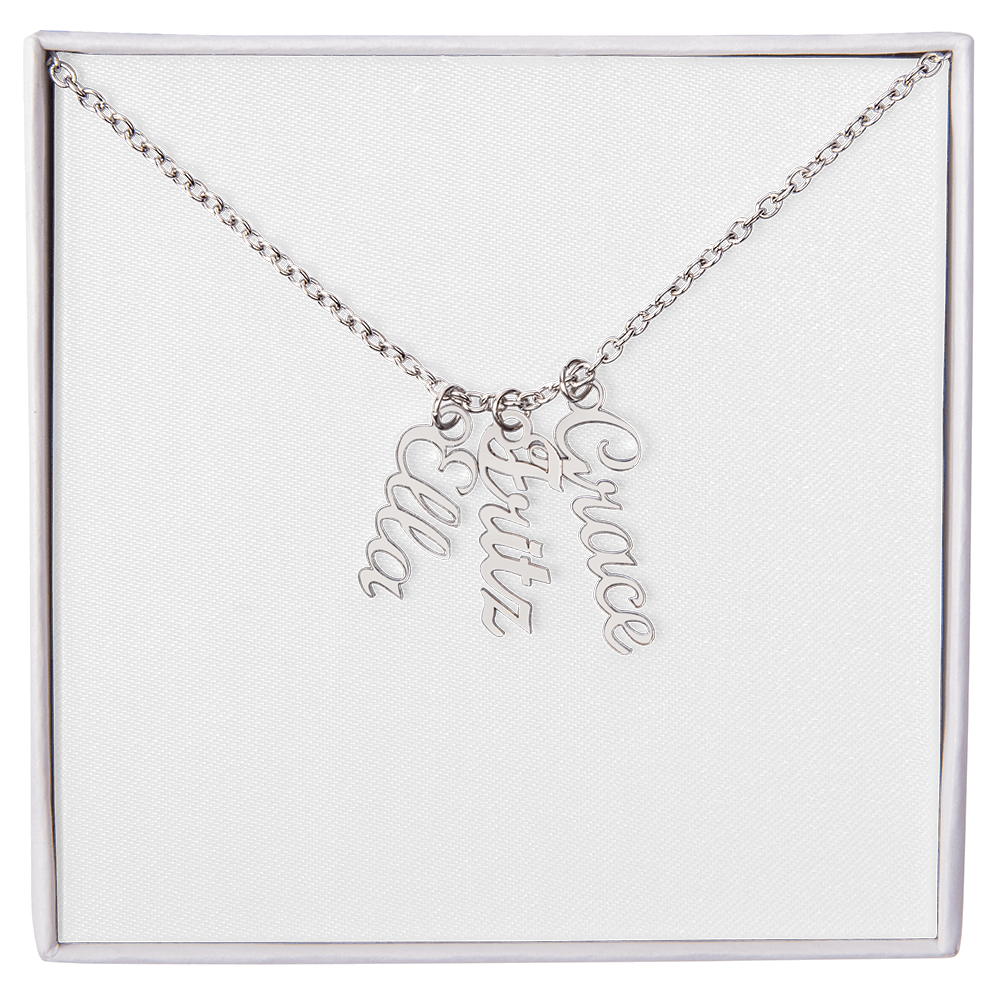 Personalize this elegant vertical name necklace with up to four names arranged in graceful, stacked lettering. A sophisticated accessory that honors the people closest to your heart, this customizable pendant transitions seamlessly from everyday wear to special occasions. Whether commemorating family bonds, celebrating friendships, or creating a heirloom piece, this necklace combines timeless design with meaningful personalization. A refined choice for those who appreciate understated elegance.