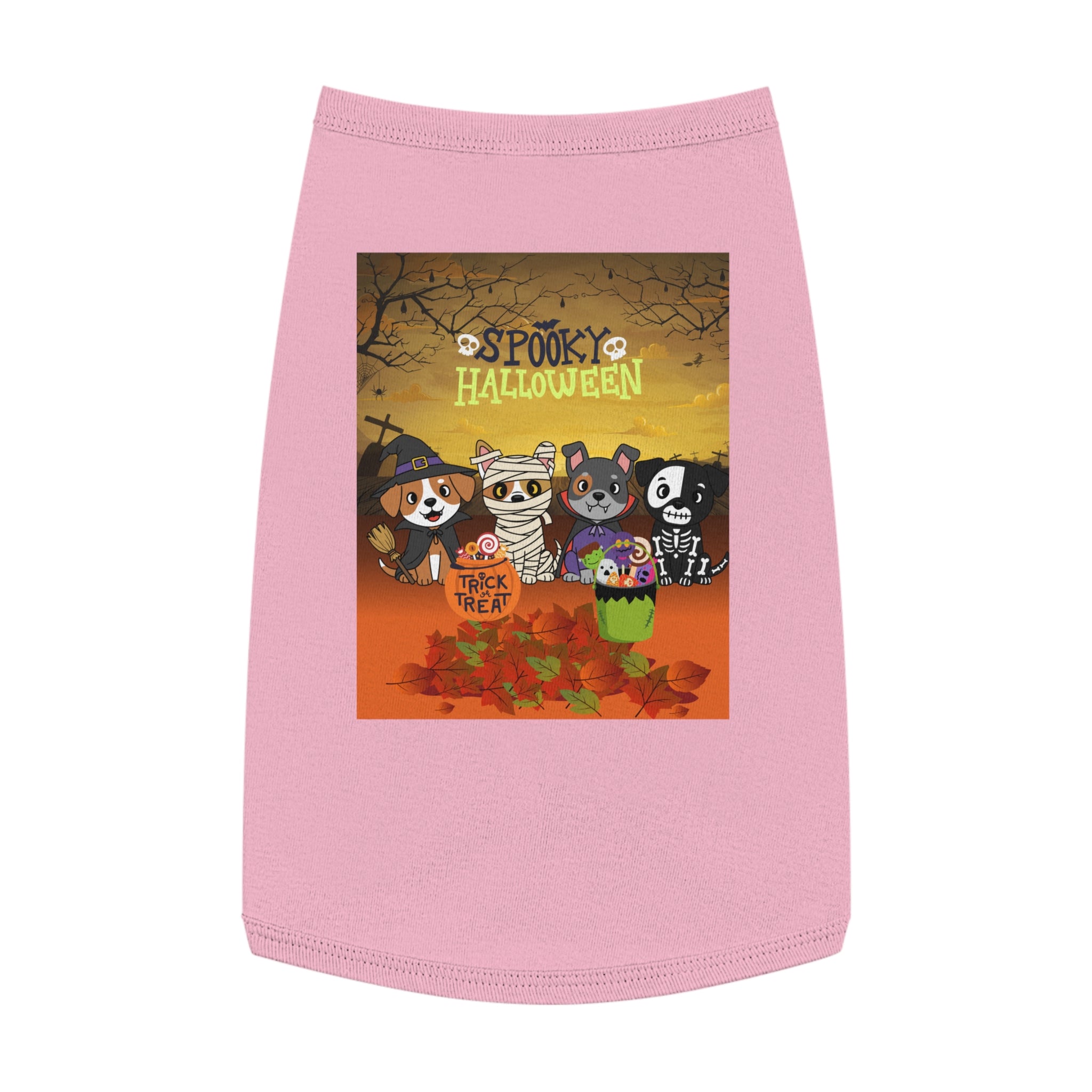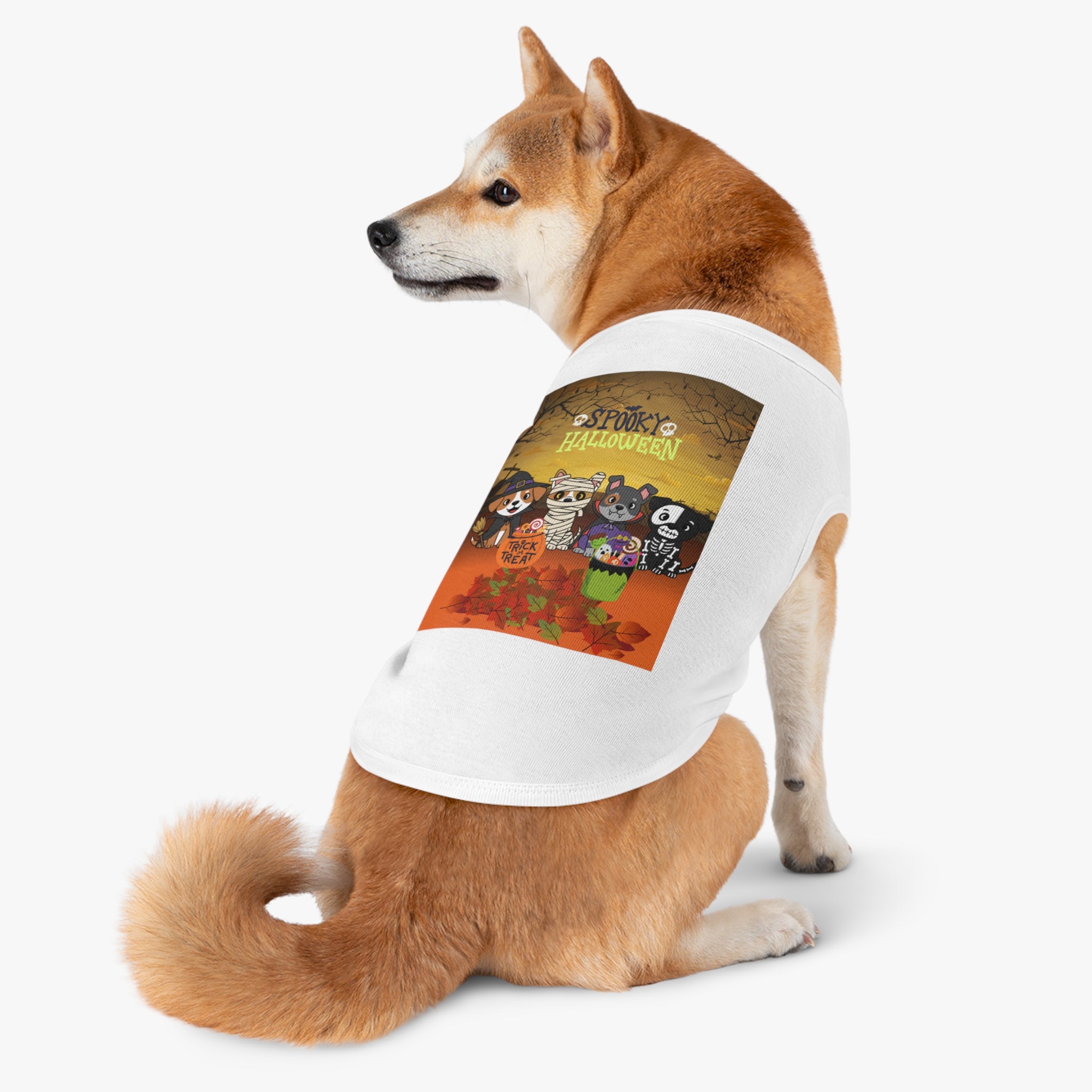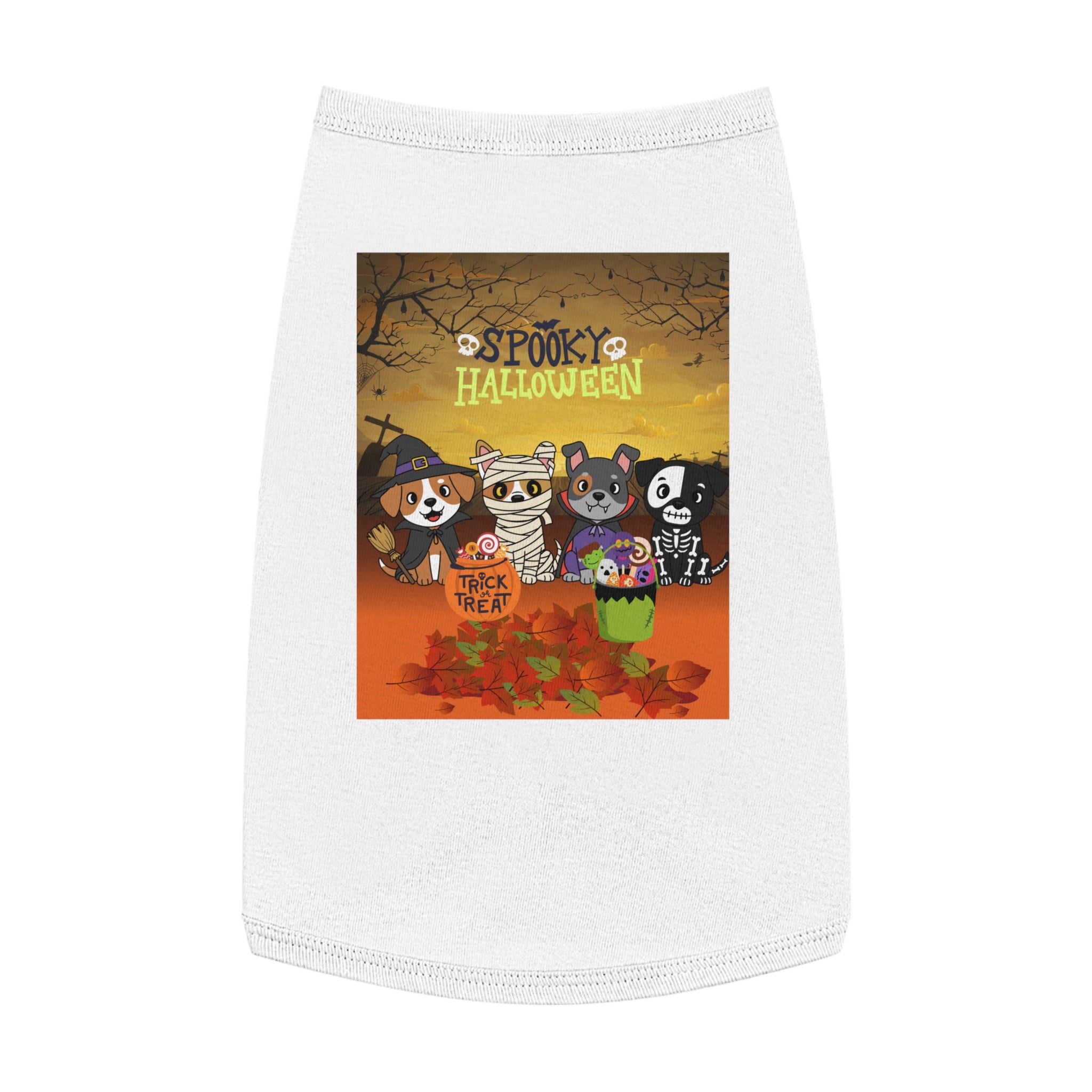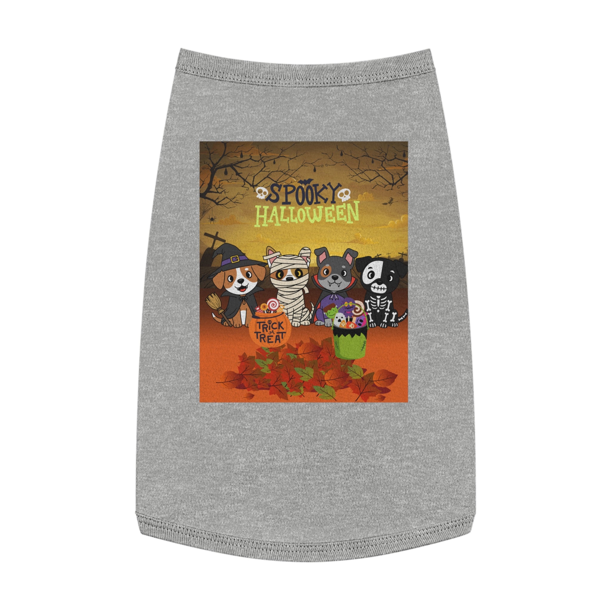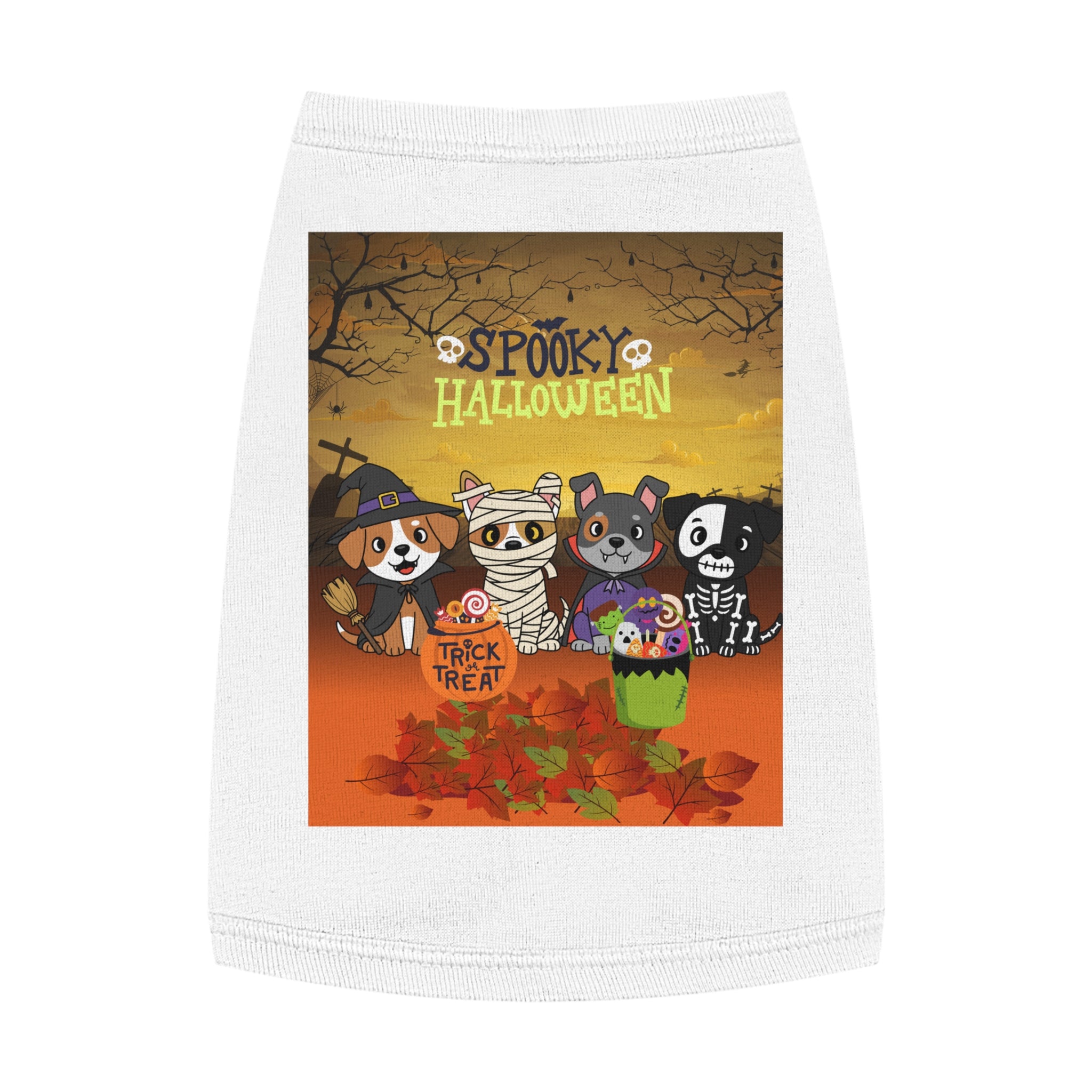 This Pet Tank Top features spooky halloween costumed dogs, perfect for the Halloween season. It is made from strong and smooth fabric, making it comfortable for your furry friend. The elastic rib knit helps retain its shape while the double-needle ribbed binding provides clean garment lines. Ideal for pet owners looking to dress up their pets for Halloween festivities.